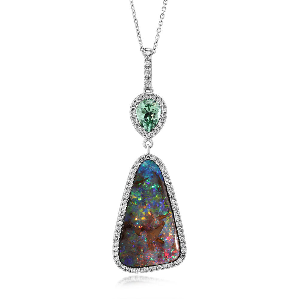Platinum Australian Boulder Opal/Mint Garnet/Diamond Pendant. Pendant does not include a chain unless specified. This is a one of a kind piece. Total gem weight: 14.39 ct.