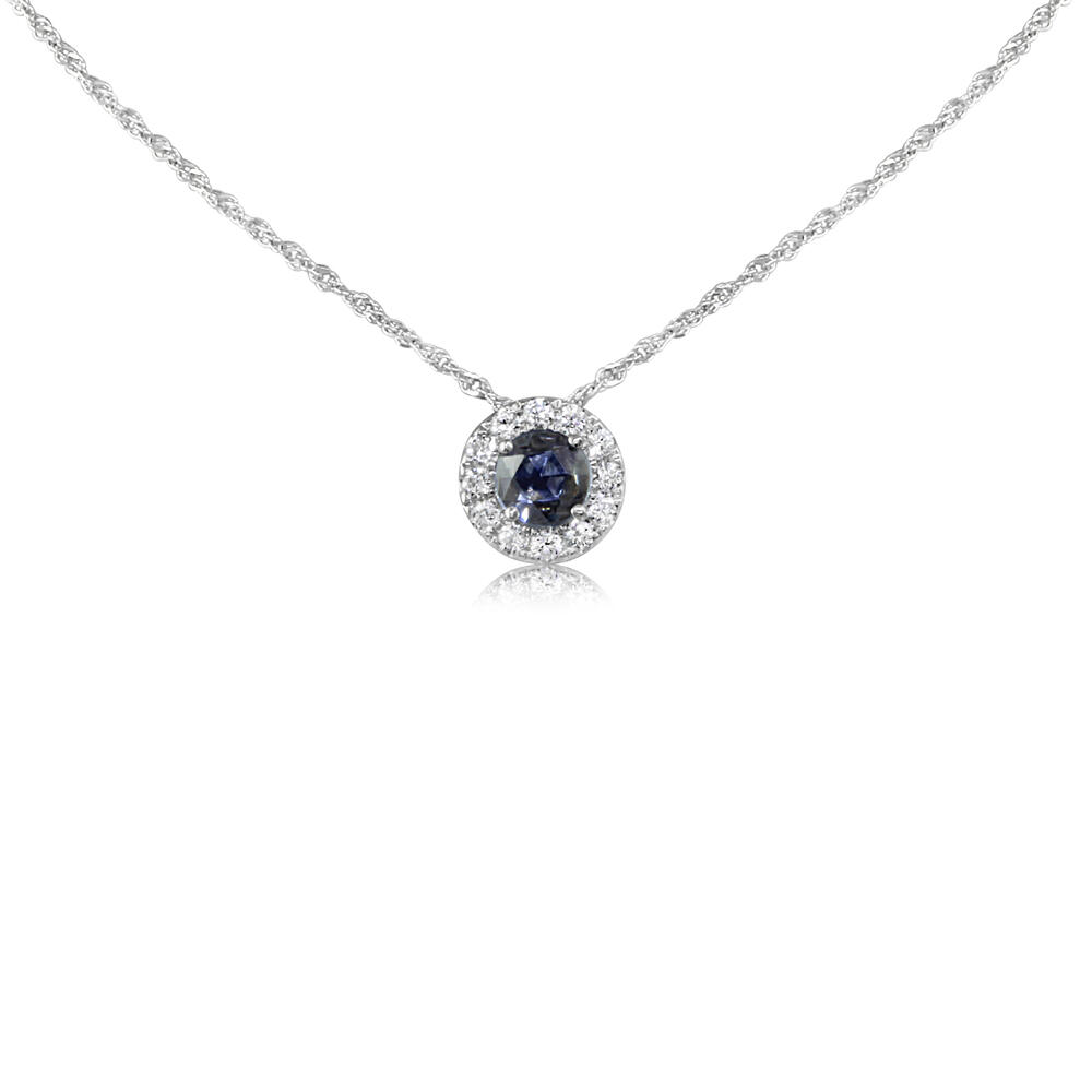 14K White Gold Montana Sapphire/Diamond Pendant. Pendant does not include a chain unless specified. Total gem weight: 0.69 ct.