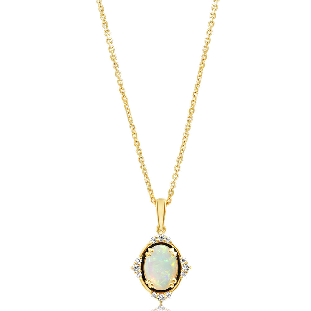 14K Yellow Gold Australian Opal/ Diamond Pendant with Black Enamel. Pendant does not include a chain unless specified. Total gem weight: 0.75 ct.