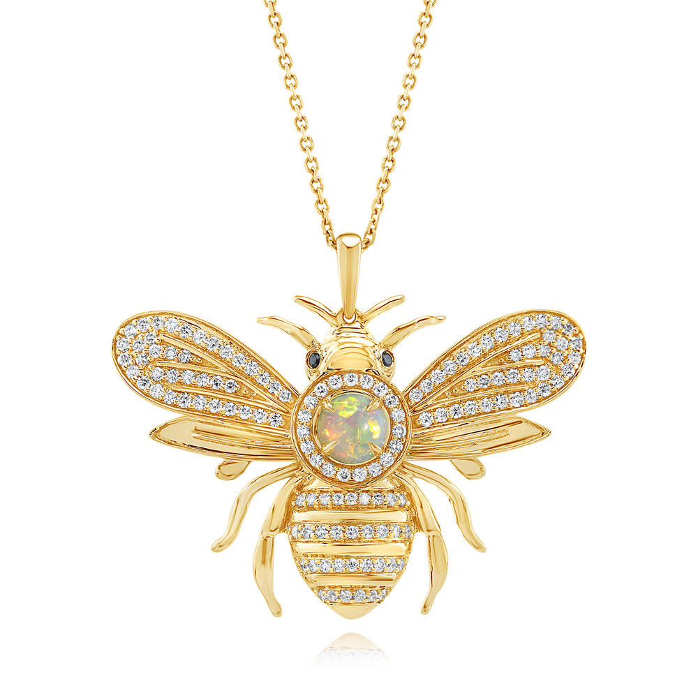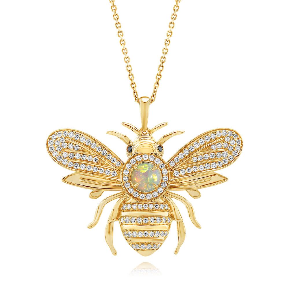 14K Yellow Gold Australian Opal/Diamond/Black Diamond Bee Pendant. Pendant does not include a chain unless specified. Sample Image. Actual piece might differ from current image. Total gem weight: 0.31 ct.
