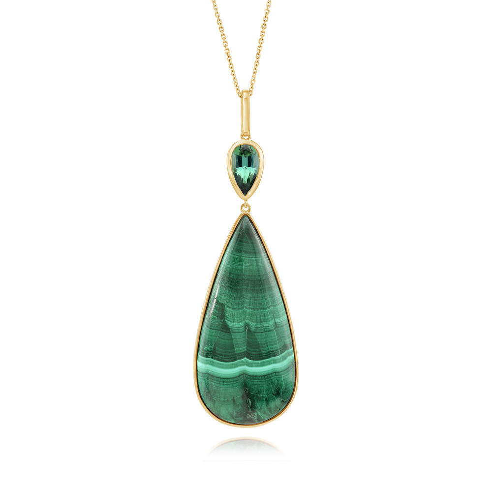 14K Yellow Gold Chatoyant Malachite/Green Tourmaline Pendant. Pendant does not include a chain unless specified. This is a one of a kind piece. Total gem weight: 54.04 ct.
