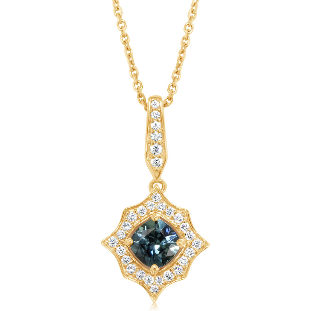 14K Yellow Gold Montana Sapphire/Diamond Pendant. Pendant does not include a chain unless specified. Total gem weight: 0.80 ct.