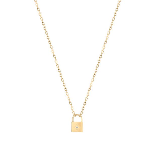 Rehana Yellow 14 Karat Fine Link Necklace Length 18 to 20 inches With Round Diamondsane Padlock