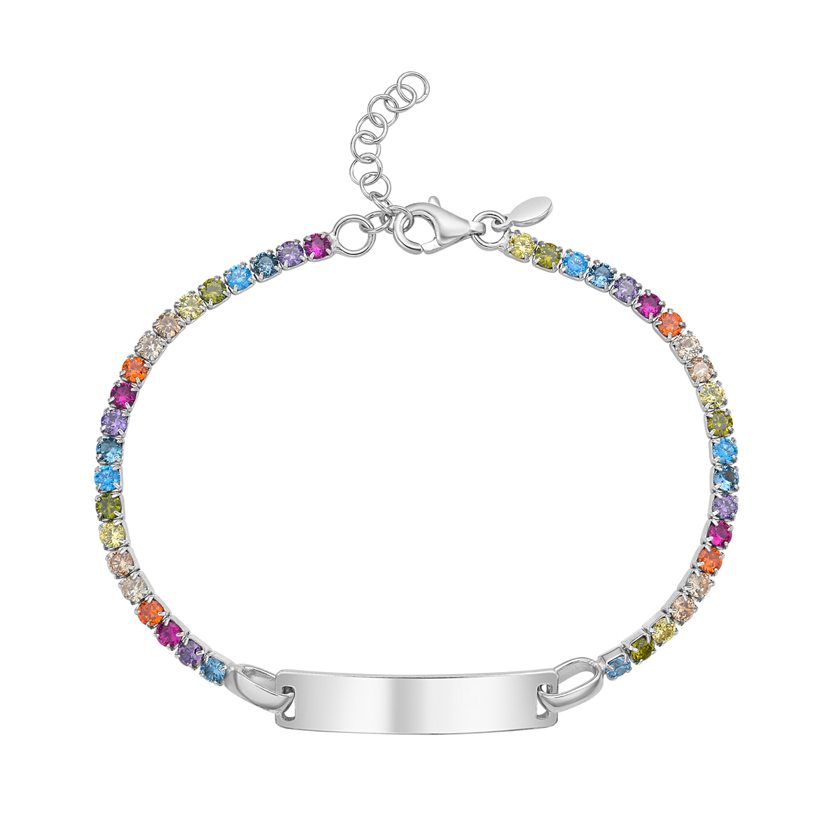 Sterling Silver 7.5″ Polished ID Bracelet with Rainbow Cubic Zirconia Stones and Lobster Clasp. Includes 1″ Extender. CUBIC ZIRCONIA, Sterling Silver, Silver, Bracelet