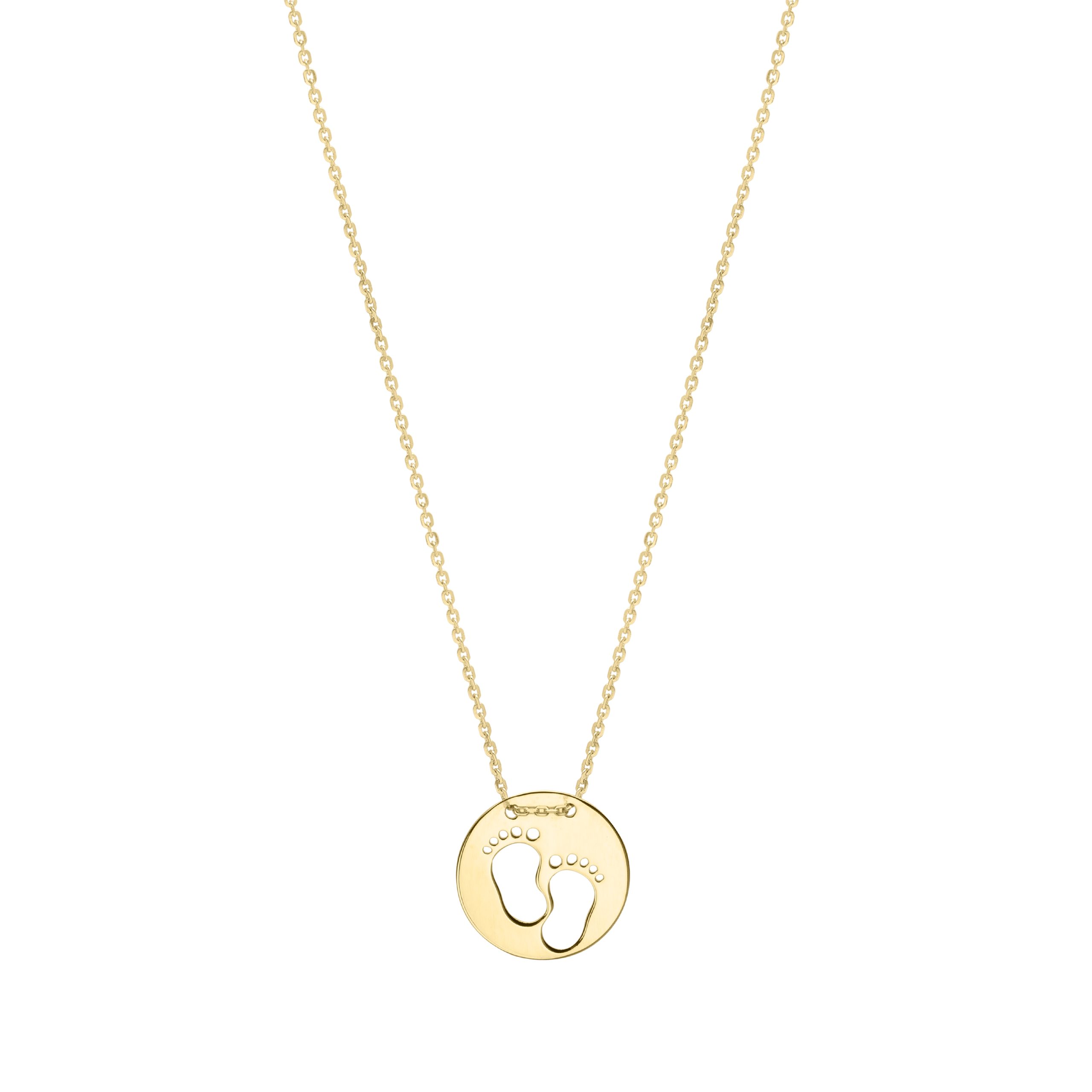 10K Yellow Gold Polished 18″ Baby Footprints Necklace with Spring Ring Clasp. Jump ring at 16″.
