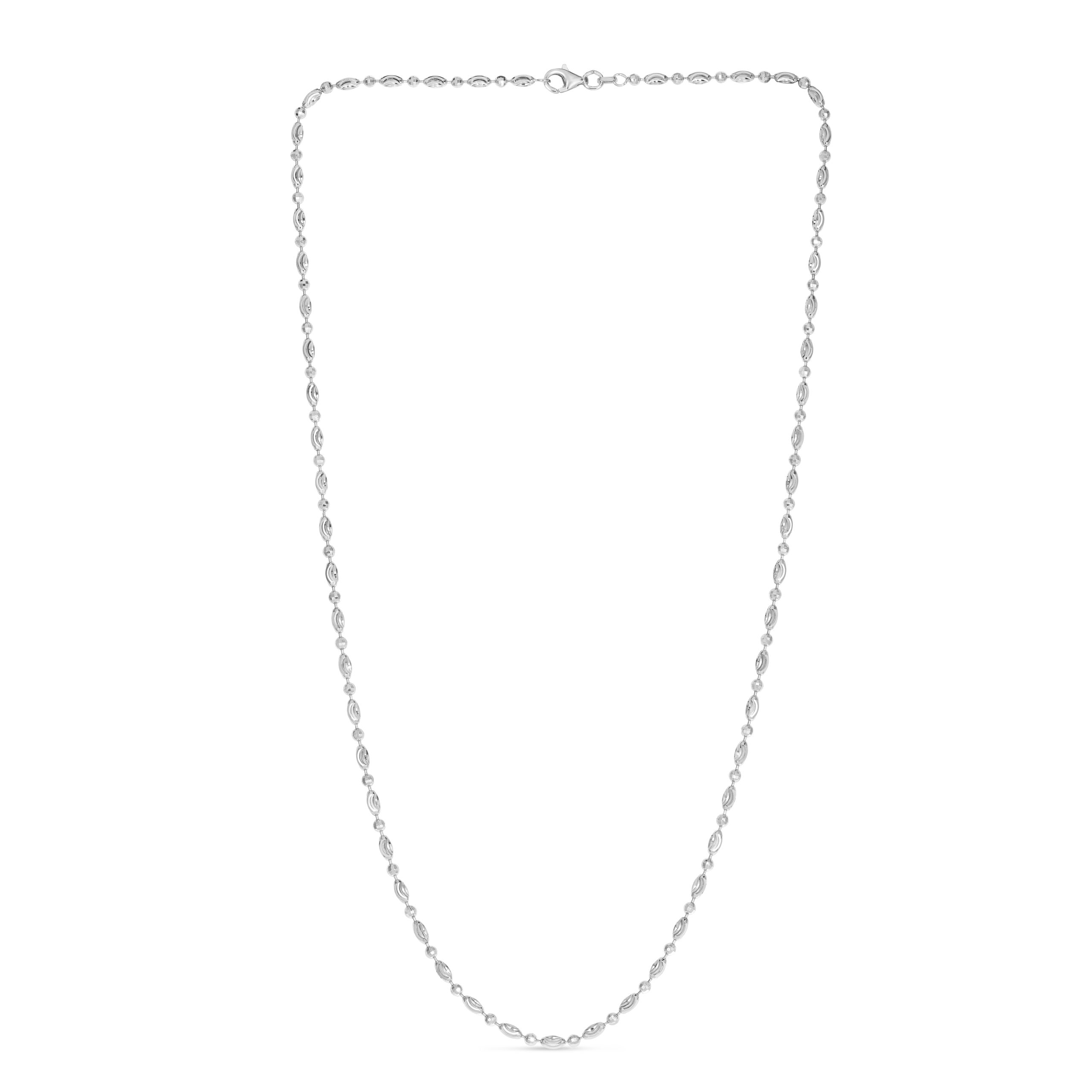 Sterling Silver 2.5mm 16″ Moon-cut (diamond cut) Oval Bead Chain Necklace with Lobster Clasp. Item has rhodium plating.