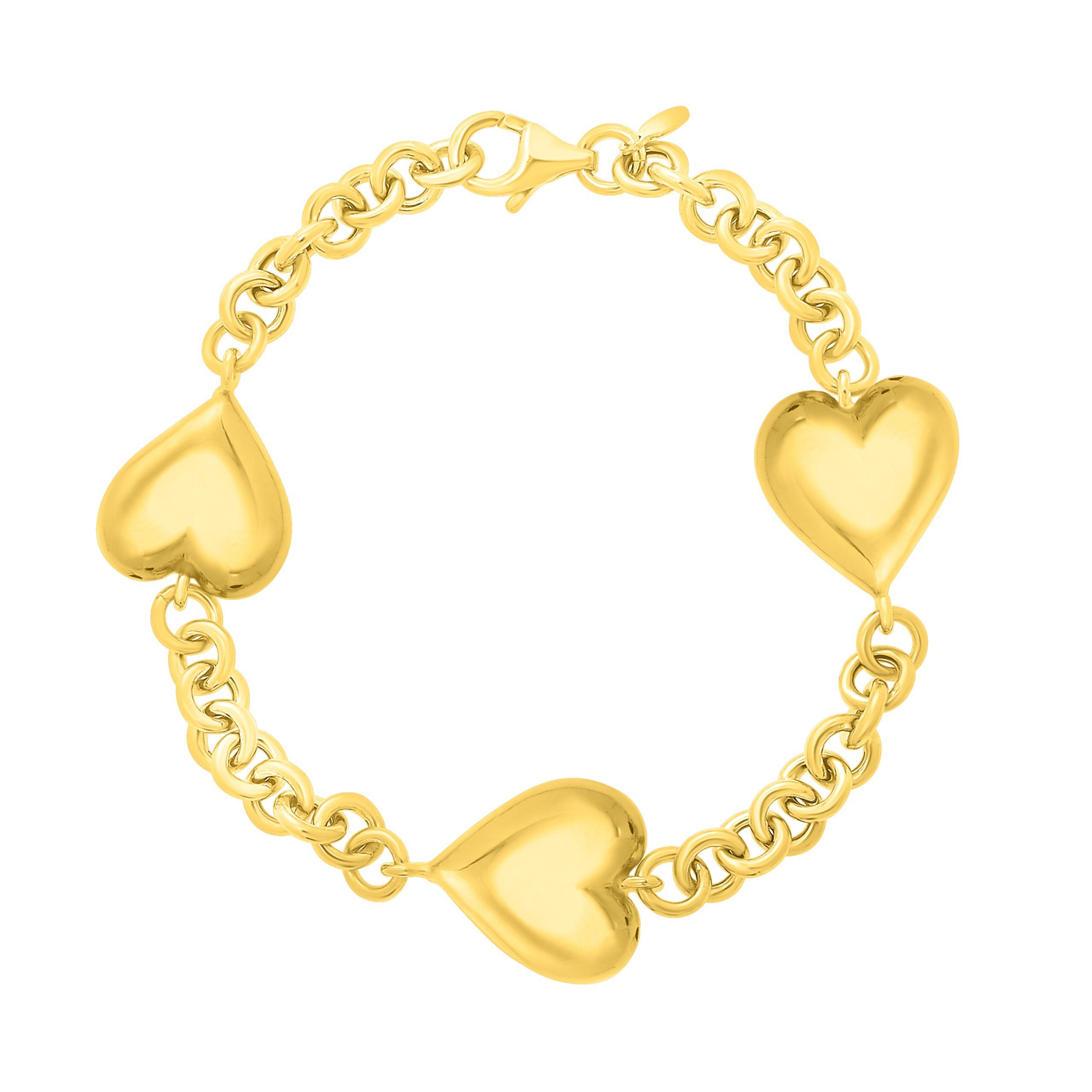 Sterling Silver (Yellow Gold Plated) Polished Puffed Triple Heart 7.5″ Bracelet with Lobster Clasp.