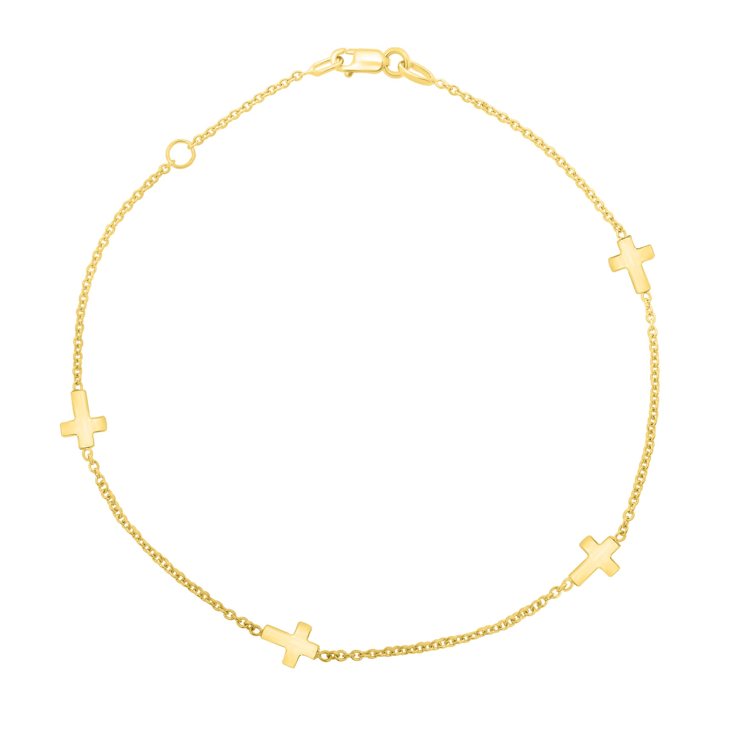14K Yellow Gold Polished Station Cross Anklet with Lobster Clasp. Total length 10″ with jump ring at 9.”