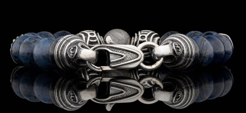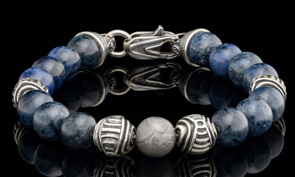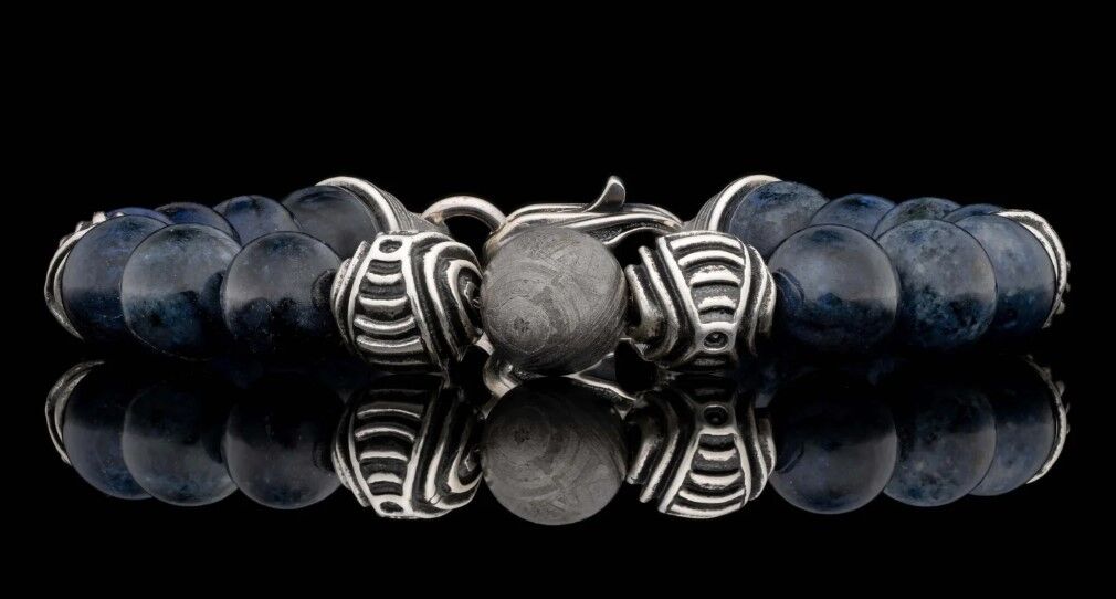 featuring 10mm beads in ceramic coated Gibeon meteorite, sculptural patinated sterling silver, and polished blue dumortierite