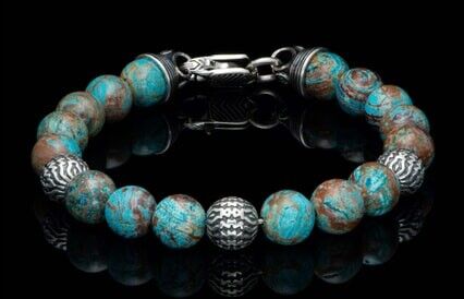 The Seaside takes center stage on the wrist – big enough to really make statement but still comfortable and designed for anything from denim to business attire. Three finely sculpted beads in sterling silver are surrounded by the cool earth tones of BlueLace Agate, all threaded onto our welded stainless steel aircraft cable for durability. Each bracelet is finished with our end caps and a custom lobster clasp wrought from sterling silver.