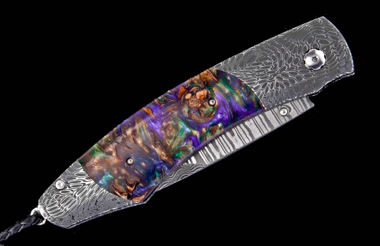 The Spearpoint ‘Big Easy’ features a beautiful frame in ‘River Rock’ damascus by Chad Nichols, inlaid with mini pine cones in resin. The blade is ‘Wave’ pattern damascus steel with an extra-strong core of ZDP-189. The one-hand button lock and the thumb stud are set with smoky quartz gemstones. A remarkable design that gives you an instrument with a full-size secure grip, and a versatile deep-belly blade, the Spearpoint epitomizes William Henry’s core philosophy – that superlative function deserves to be elevated to superlative art. The ‘Big Easy’ also features William Henry’s most admired and distinctive forged metals; a timeless heirloom to be proudly worn and used for a lifetime before being handed-down to another generation