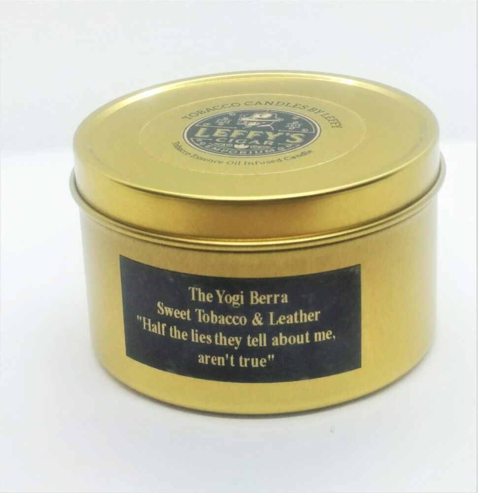 The Yogi Berra Sweet Tobacco & Leather “Half the Lies they tell about me aren’t True” in 7 oz Vintage Gold Tobacco Tin