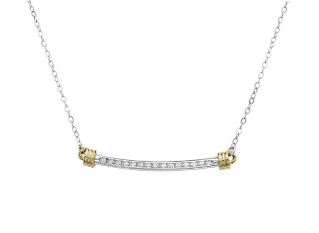 Two Tone .925 & 14K Bar Silver Necklace With 15 = 0.30Tw Round Si1 Diamonds Chain: Cable Link Metal: .925 Color: White Length: 18 1.4mm flat cable chain.. 15 channel-set diamonds, 1.75mm, 0.3tcw, SI1