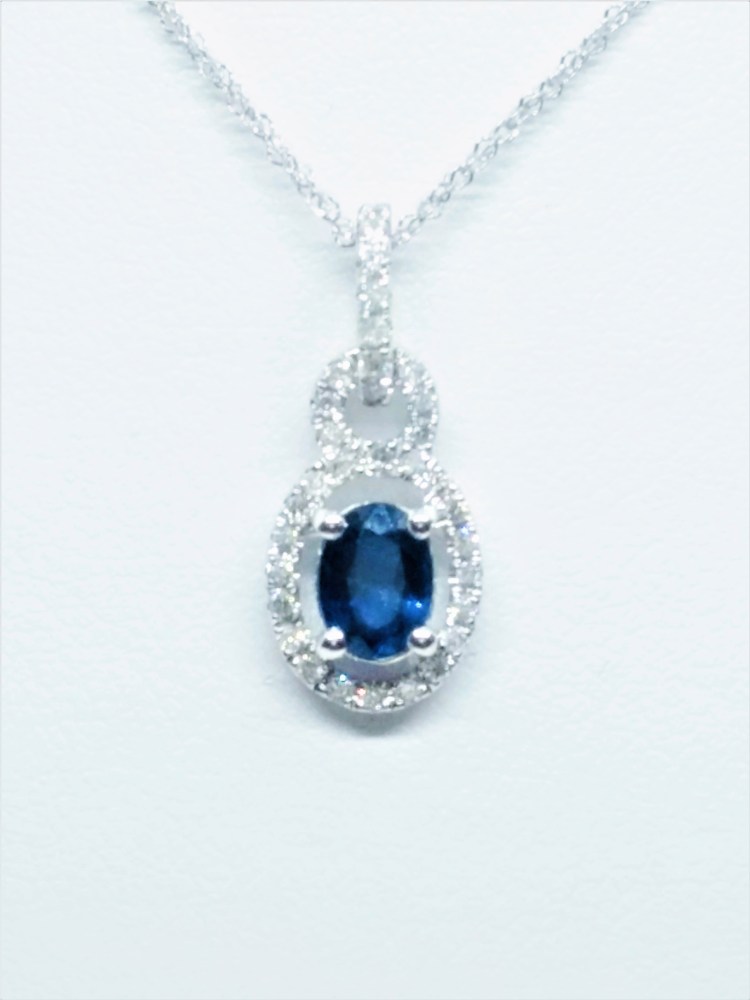 White 18 Karat Halo Pendant With One 0.81Ct Oval Blue Sapphire And 33=0.18Tw Round G Si1 Diamonds